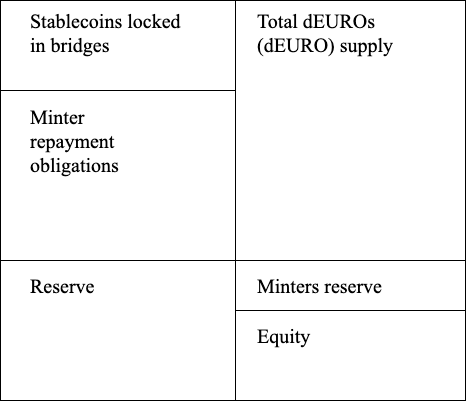 If the Decentralized Euro system was a company, its balance sheet would roughly look as shown above. On the asset side, the system has all the stablecoins that reside in bridges (x), it has given loans to minters that they need to repay (m), and it has a number of Decentralized Euro in its reserves (r). On the liabilities side, there are all the Decentralized Euros in circulation (z), the reserve (b) it owes to the minters, and the equity (e) owned by the pool share holders.
